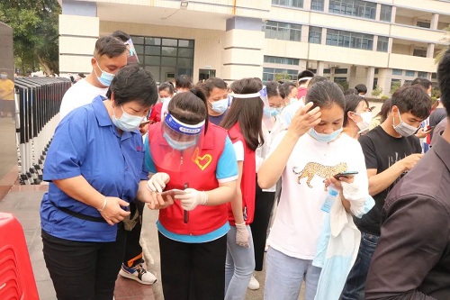 从早上8点半起,周边企业的员工们就分批来到等待区域。“请往这里走。”“麻烦出示一下行程码。”一抹抹白色与红色交织的身影,正在进行现场分流引导、帮忙查询行程,他们正是由迈锐光电党支部党员和入党积极分子组成的7人志愿者队伍。在他们的助力下,现场每个步骤环环相扣、有条不紊,在当日16时即完成全部6500余人的核酸检测工作,让党旗在防疫一线高高飘扬。