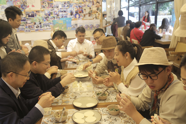 随后,党员们和“星员工”们围坐一堂,同包饺子。饺子,是连接孤独症青年们与社会的桥梁。将饺子皮平铺在手心,舀馅、捏褶,指尖翻飞间,一个个饺子便陆续成型——“星员工”们化身小导师,一丝不苟地向党员们传授技巧,现场欢声笑语不断,大家也频频为“星员工”们娴熟的技术点赞。沟通交流中,大家进一步提高了对孤独症的认识,增进了对他们的理解和接纳。